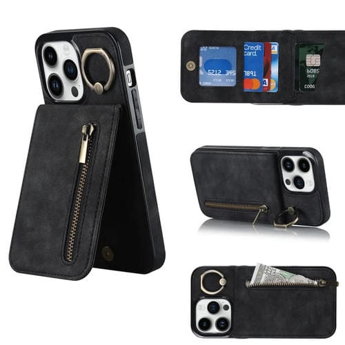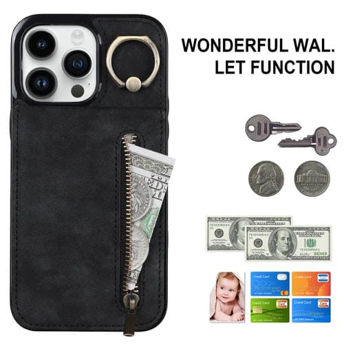 Funda para iPhone 12 Pro Max Retro Ring y Zipper Rfid Card Slot (Negro)