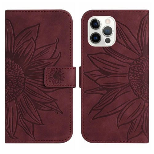 Funda para iPhone 12 Pro Max Skin Feel Flip de Cuero con Cordón y Patrón Sun Flower (Rojo Vino)