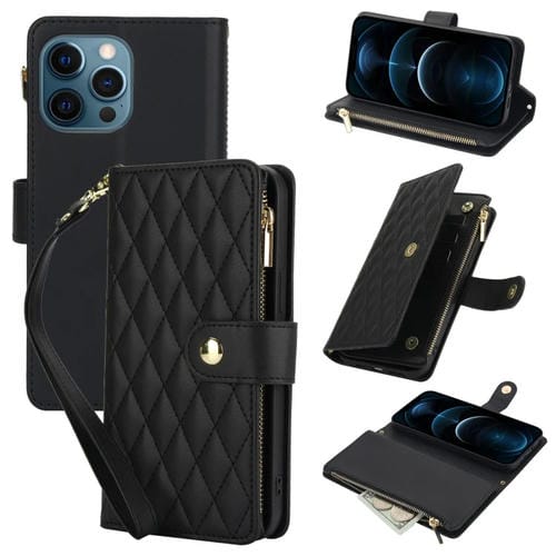Estuche para teléfono iPhone 12 Pro Max Ym016 con billetera de cuero, cremallera rómbica y cordón (Negro)