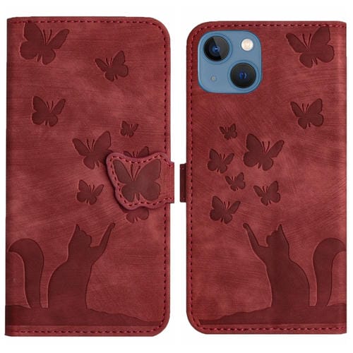 Funda para Teléfono iPhone 13 Cuero con Tapa Estampado Gato Mariposa (Rojo)