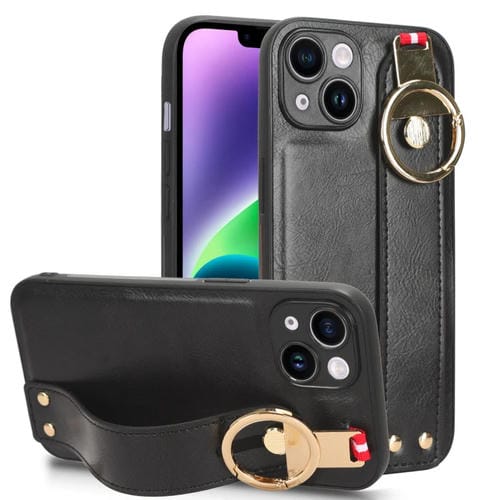 Funda Trasera de Cuero para iPhone 13 con Muñequera (Negro)