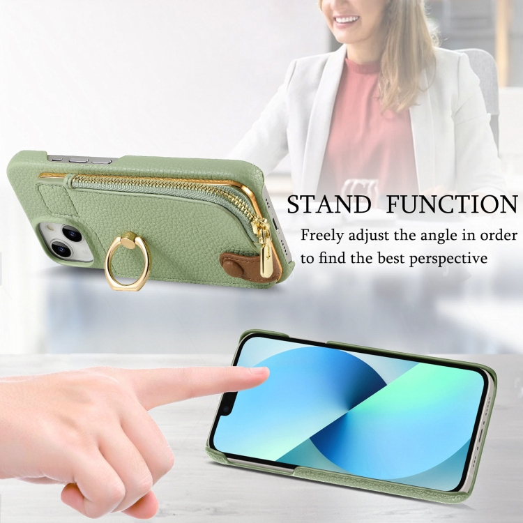 Funda Trasera para iPhone 13 con Billetera, Cremallera y Anillo de Cuero Litchi (Verde Té)