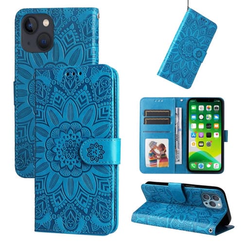 Estuche para teléfono iPhone 13 Mini cuero con estampado de girasol en relieve (Azul)