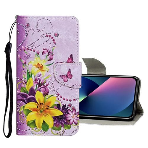 Funda de Cuero para iPhone 13 Mini con Tapa de Patrón Dibujo Coloreado (Mariposa de Flor Amarilla)