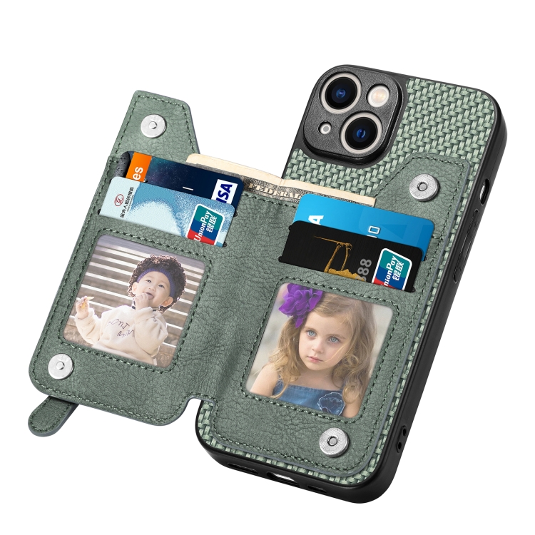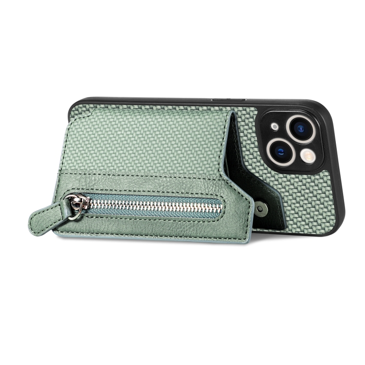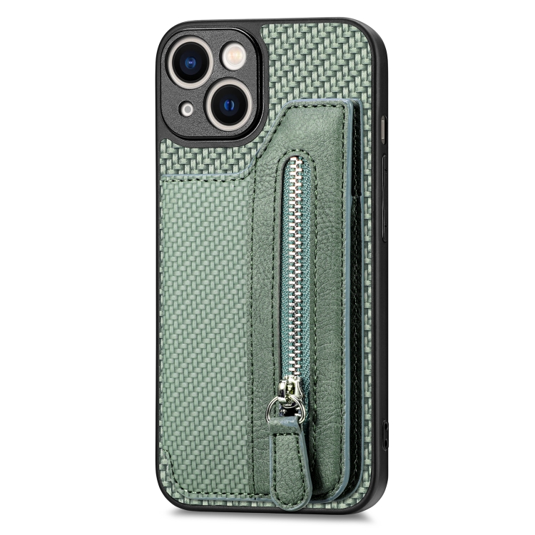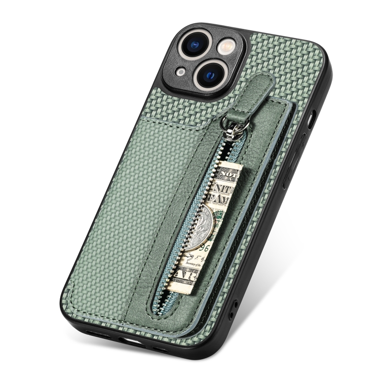 Funda de teléfono para iPhone 13 Mini con Cremallera y Tapa Horizontal de Fibra de Carbono (Verde)