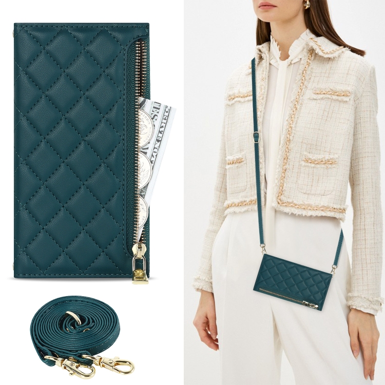 Funda de Cuero para iPhone 13 Mini Grid Texture con Lanyard y Cremallera (Verde)