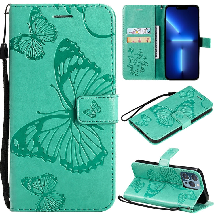 Estuche de Cuero para iPhone 13 Pro con Tapa Horizontal Patrón Mariposa 3D Soporte Ranura Tarjeta Billetera Cordón (Verde)