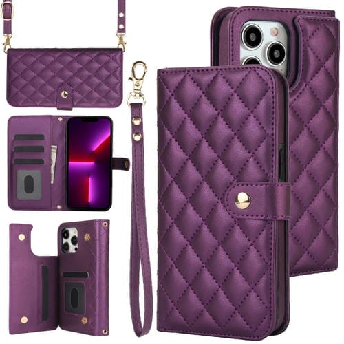 For iPhone 13 Pro Max Crossbody Phone Case Multi-function Rhombic Leather Case (Dark Purple)