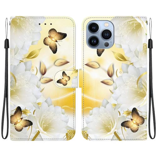 For iPhone 13 Pro Max Crystal Texture Colored Drawing Leather Phone Case (Golden Butterfly Epiphyllum)