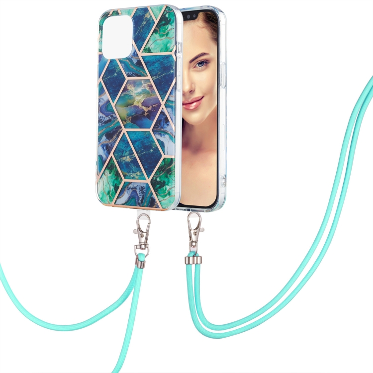 Estuche para iPhone 13 Pro Max Galvanoplastia Empalme Mármol Patrón Doble Cara Imd TPU a Prueba de Golpes con Cordón para El Cuello (Azul Verde)