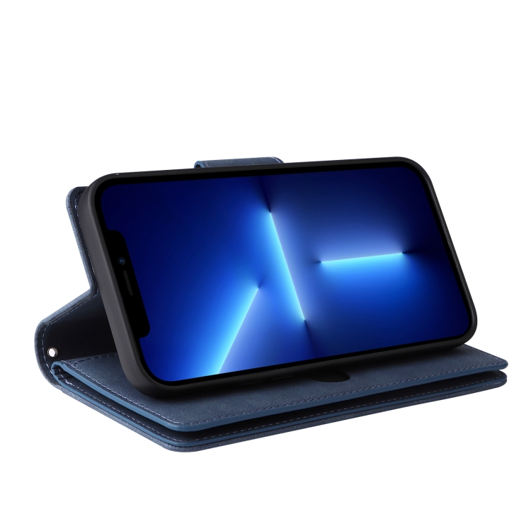 Funda para iPhone 13 Pro Rivet Buckle 9 Cards Cuero Tres Pliegues (Azul)