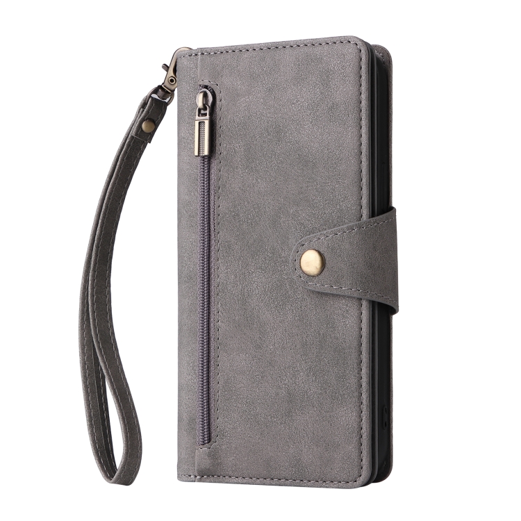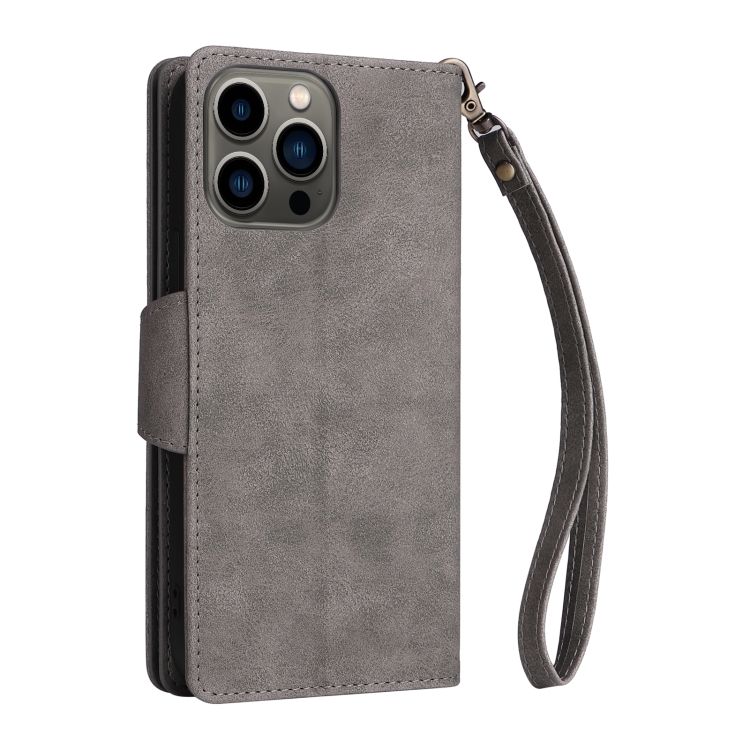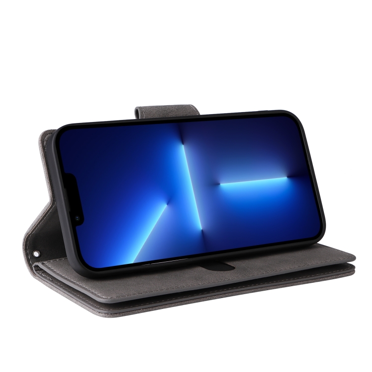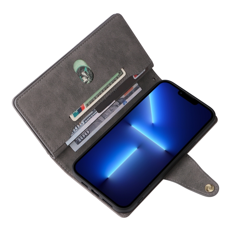 Funda para iPhone 13 Pro Rivet Buckle 9 Cards Cuero Tres Pliegues (Gris)
