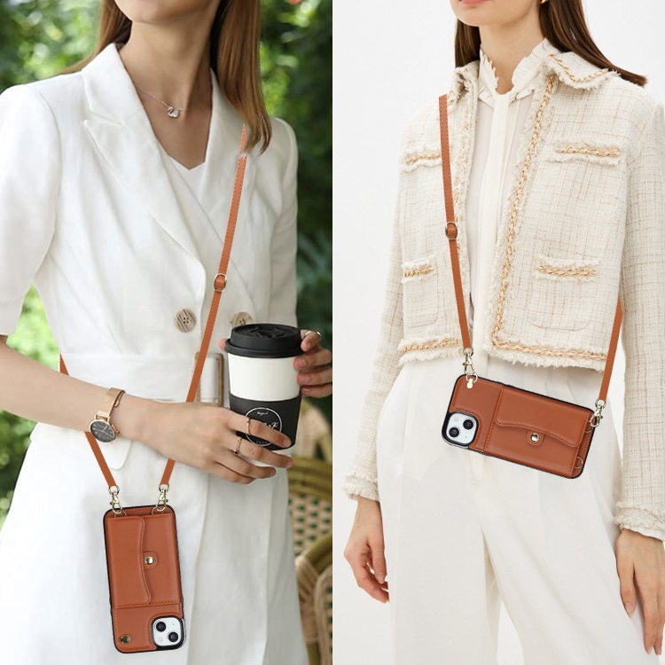 Estuche para Teléfono iPhone 14/13 con Ranura para Tarjeta Rfid y Cordón Largo (Marrón)