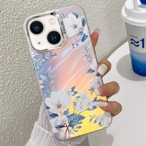 Funda para iPhone 14 TPU con Textura de Flor Láser Galvanoplastia (Flor Blanca)