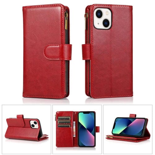 Estuche de Cuero para iPhone 14 Multifuncional con 9 Ranuras para Tarjetas (Rojo)