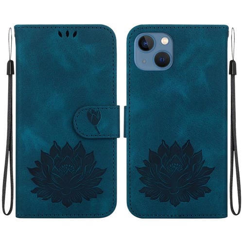 Funda de Cuero para iPhone 14 con Relieve de Loto (Azul Oscuro)