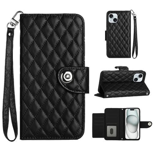 Funda de Cuero para iPhone 14 con Tapa Textura Rómbica y Cordón (Negro)