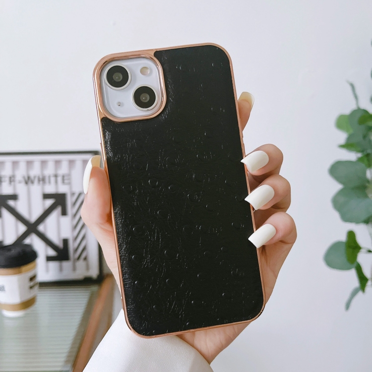 Funda para iPhone 14 Nano de Textura de Avestruz de Cuero Genuino (Negro)