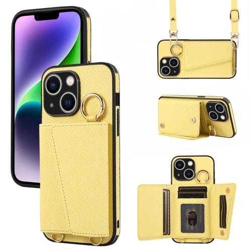 Funda para Teléfono iPhone 14 con Contraportada de Cuero Billetera y Anillo Cruzado (Amarillo)