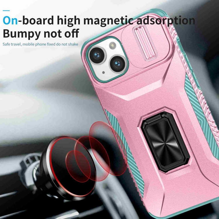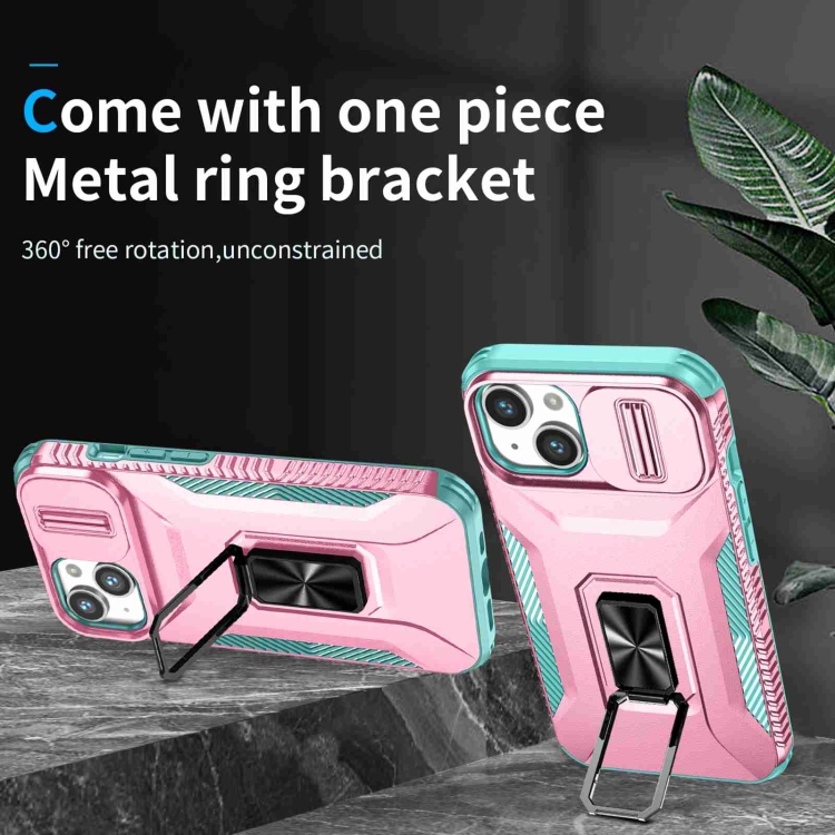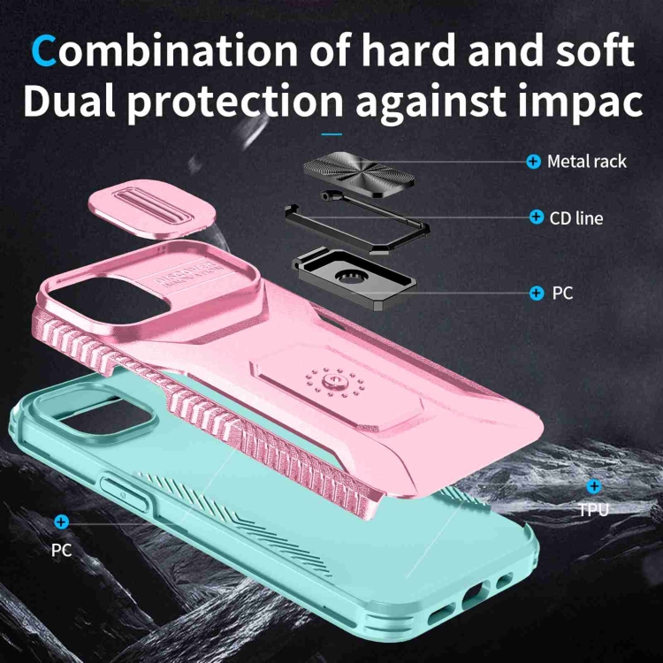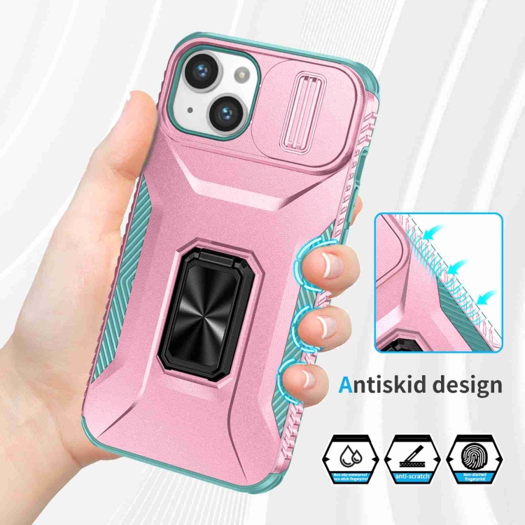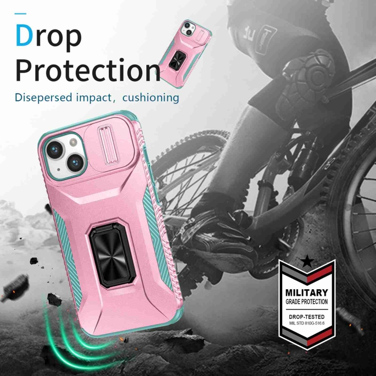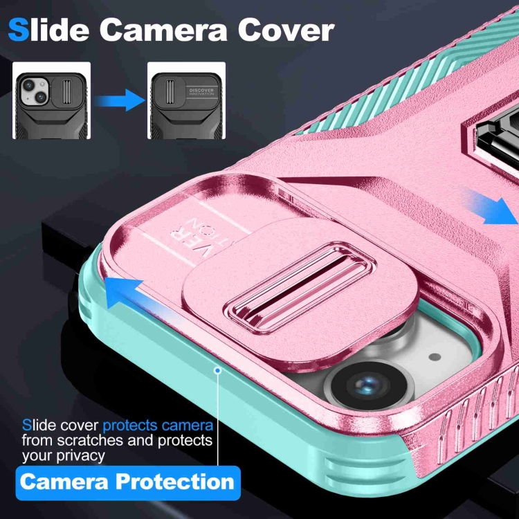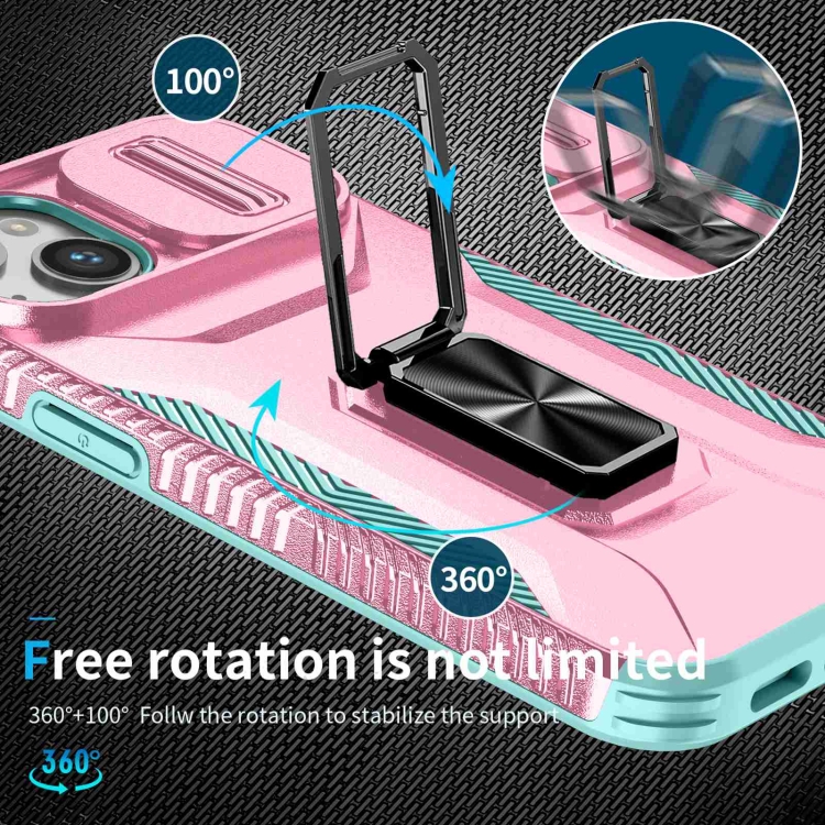 Funda para Teléfono iPhone 14 con Soporte Deslizante para Escudo de Levas (Rosa + Gris Verde)