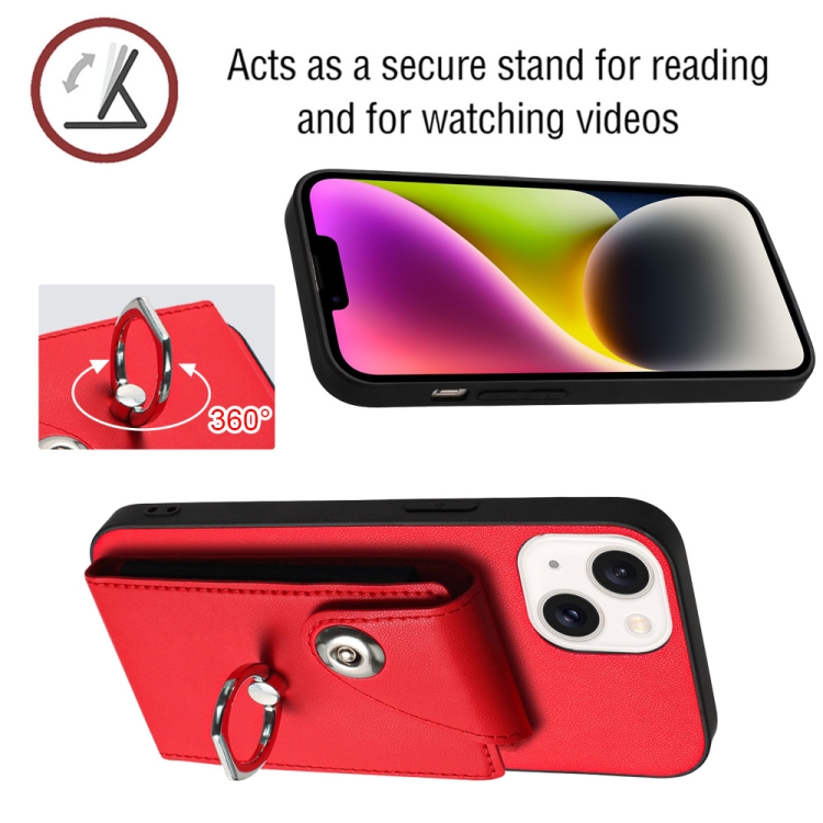 Funda para Teléfono iPhone 14 con Soporte para Anillo y Bolsa para Tarjeta con Cordón Largo (Rojo)
