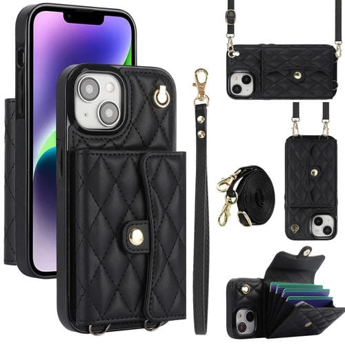 Funda para Teléfono iPhone 14 Cuero con Billetera Horizontal Rombal Cruzada (Negro)