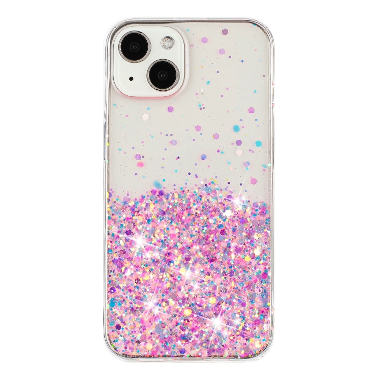 Funda para Teléfono TPU iPhone 14 con Polvo de Brillo Noctilucente y Marco Transparente (Rosa)