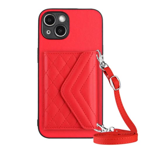 Funda para Teléfono iPhone 14 con Bolsa para Tarjetas Rfid Textura Rómbica y Cordón Largo (Rojo)
