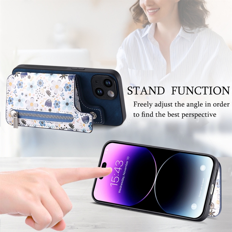Funda Trasera para Teléfono iPhone 14 con Billetera con Cremallera Pintada Retro (Azul)
