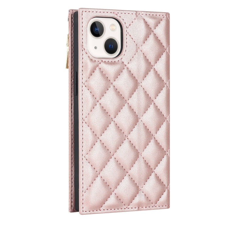 Funda de Cuero con Cremallera para iPhone 14 Grid Texture Lanyard (Oro Rosa)