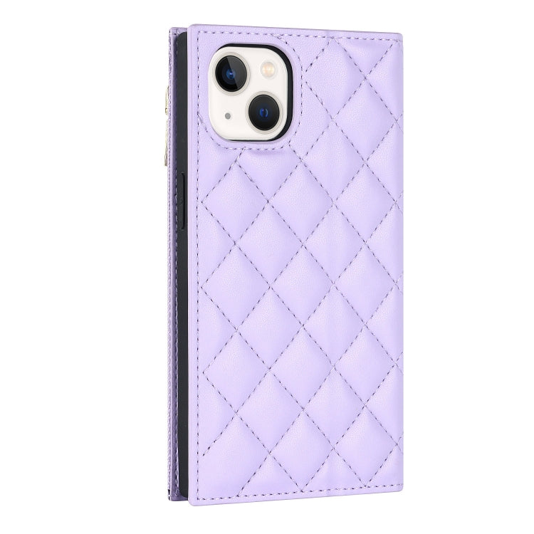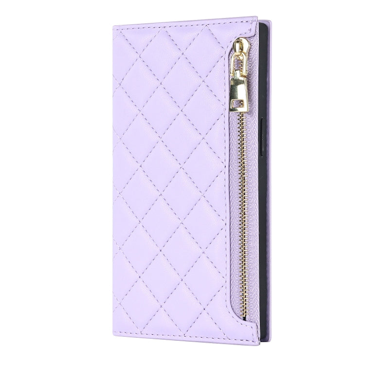 Funda de Cuero con Cremallera para iPhone 14 Grid Texture Lanyard (Púrpura)