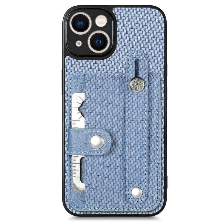 For iPhone 14 Wristband Kickstand Card Wallet Back Cover Phone Case with Tool Knife (Blue)