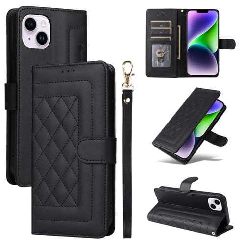 Estuche para Teléfono iPhone 14 Plus con Tapa de Cuero y Entramado de Diamantes (Negro)