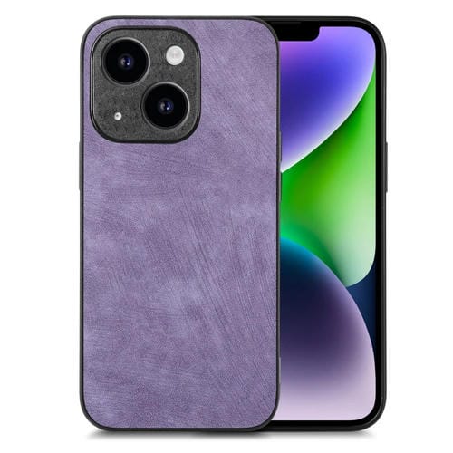 Funda de teléfono para iPhone 14 Plus con contraportada de PC de cuero vintage (Púrpura)