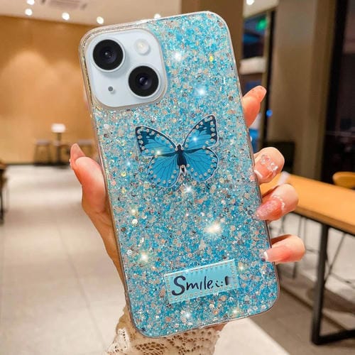 Funda para Teléfono TPU Epoxi iPhone 14 Plus con Mariposa y Diamantes de Imitación con Lentejuelas Estrelladas (Azul)