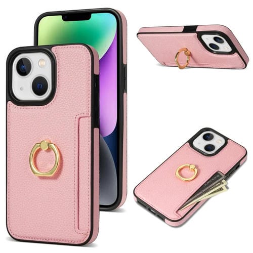 Funda Trasera para iPhone 14 Plus Ring Card Litchi de Cuero (Rosa)