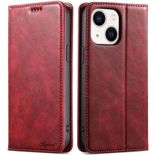 Funda de Cuero Suteni J02 para iPhone 14 Plus con Billetera y Cera de Aceite (Rojo)