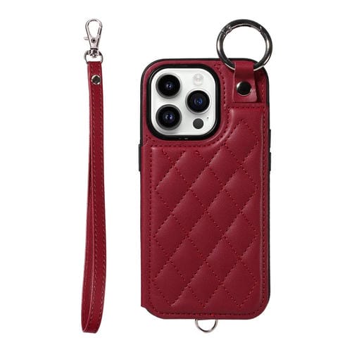 Estuche para teléfono iPhone 14 Pro con bolsa para tarjetas textura rómbica y cordón corto (Rojo Vino)