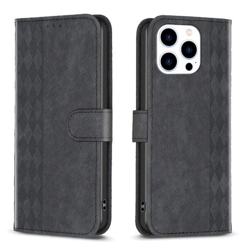 Funda de Teléfono iPhone 14 Pro Cuero En Relieve a Cuadros (Negro)