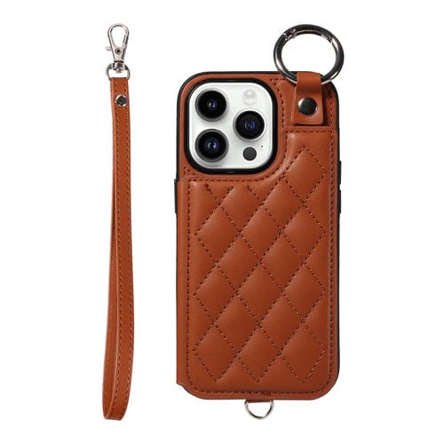 Funda para Teléfono iPhone 14 Pro con Bolsa para Tarjetas Textura Rómbica y Cordón Corto (Marrón)