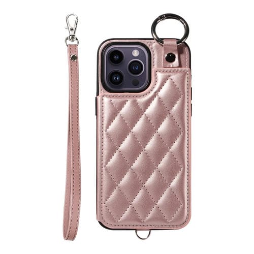 Estuche para Teléfono iPhone 14 Pro Max con Bolsa para Tarjetas Textura Rómbica y Cordón Corto (Oro Rosa)