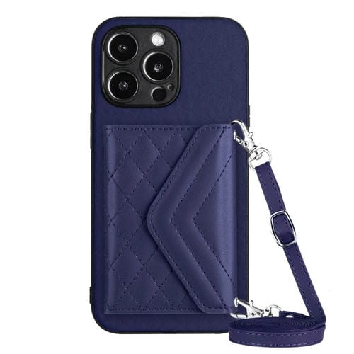 Estuche para Teléfono iPhone 14 Pro Max Rfid con Bolsa para Tarjetas Textura Rómbica y Cordón Largo (Púrpura Oscuro)