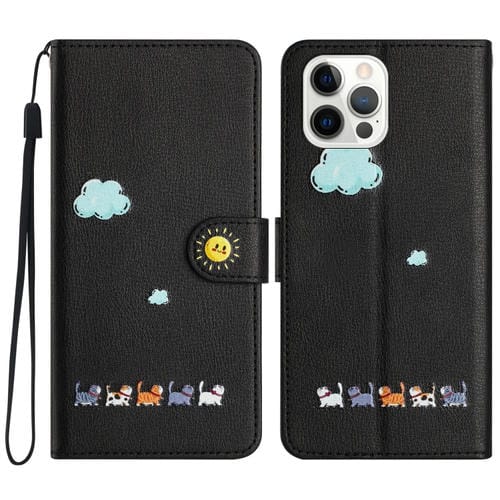 Funda para Teléfono iPhone 14 Pro Max Cuero Gatos Dibujos Animados (Negro)