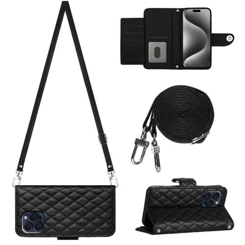 Funda para Teléfono iPhone 14 Pro Max Tapa de Cuero Textura Rómbica Cordón Largo (Negro)