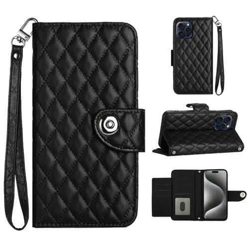 Funda para Teléfono iPhone 14 Pro Max con Tapa de Cuero Textura Rómbica y Cordón (Negro)