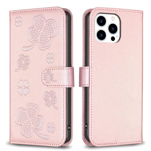 Funda para Teléfono iPhone 14 Pro Max Cuero Relieve Cuatro Hojas (Rosa)