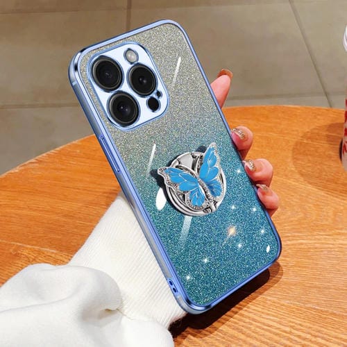 Funda para Teléfono TPU iPhone 14 Pro Max con Soporte de Mariposa y Brillo Degradado (Azul Sierra)