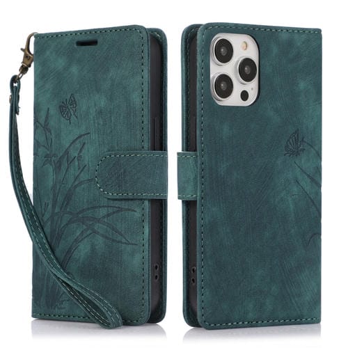 Funda de Cuero iPhone 14 Pro Max Orchid Butterfly En Relieve (Verde)
