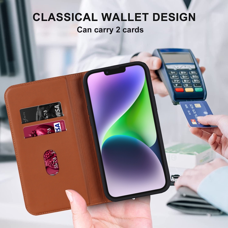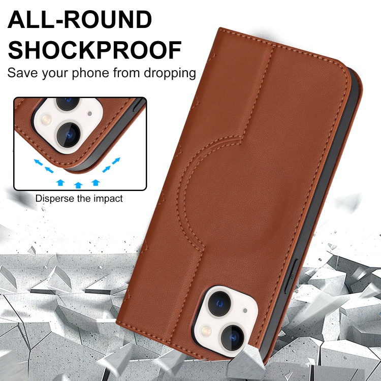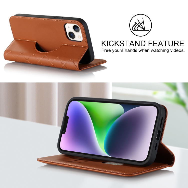 Funda para iPhone 14 Rhombic Magsafe Rfid Antirrobo de Cuero con Billetera (Marrón)