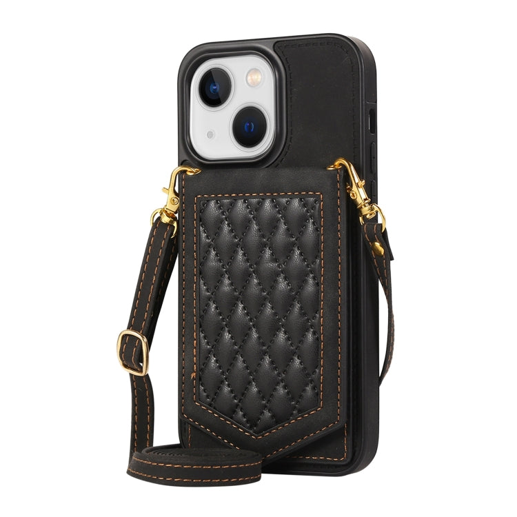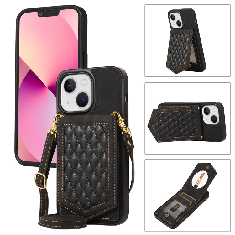 Funda para iPhone 14 Rhombic Texture Rfid con Cordón y Espejo (Negro)